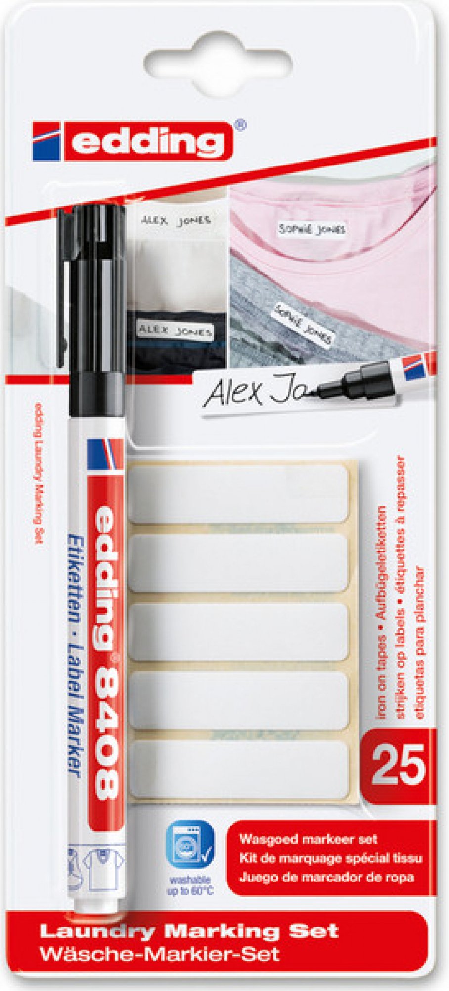Permanent marker for fine and thin writing will help you label clothing for kindergarten, school, or sports. It is sold in a set along with 25 labels that are designed for ironing onto fabric. Check out the video on how to use this kit.