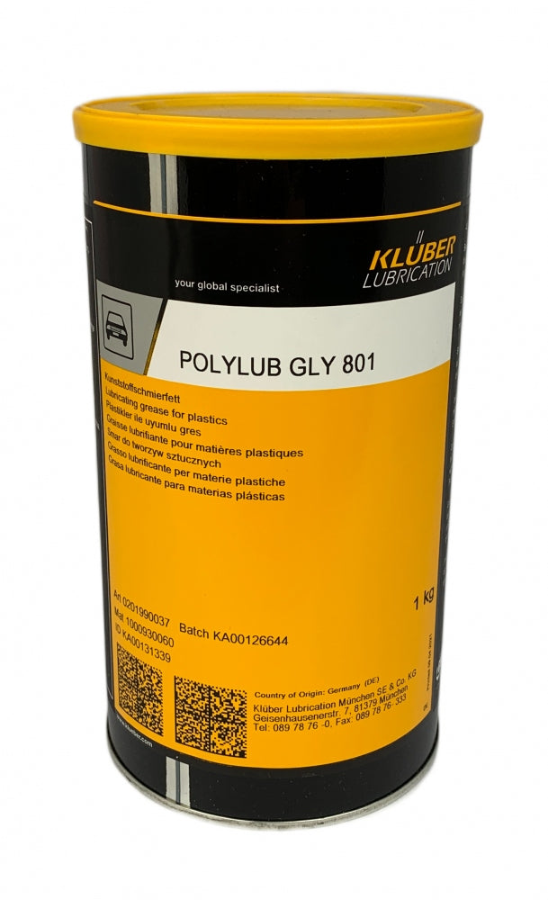 Die Produktreihe POLYLUB GLY 801 basiert auf synthetischem Kohlenwasserstofföl, Mineralöl und speziellem Lithiumseifen. Diese Schmierfette wurden entwickelt, um Reibung zu reduzieren und den Verschleiß von Gleitlagern, Gleitführungen oder kleinen Kunststoffzahnrädern zu schützen. Darüber hinaus sind die besonderen Eigenschaften der Kunststoffschmierung zu berücksichtigen. Da sich Metalle und Kunststoffe in wesentlichen Punkten unterschiedlich verhalten, müssen die Eigenschaften des Schmierstoffs an den Kunststoff angepasst werden. Kunststoffe sind im Vergleich zu Metallen relativ weich. Feste Schmierstoffe, die oft einen positiven Einfluss auf Reibstellen bei Metallen haben, können negative Auswirkungen auf Kunststoffoberflächen haben oder unwirksam sein. Mit POLYLUB 801 hat Klüber Lubrication eine Produktreihe für die Kunststoffschmierung entwickelt, die keine festen Schmierstoffe enthält und gut haftet.