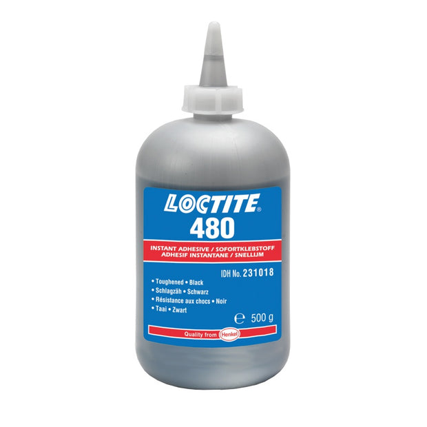 Schnell härtender Sekundenkleber Loctite 480, der hauptsächlich für Kunststoffe und Gummi geeignet ist. Es handelt sich um ein hochzähes Produkt, das auch nach dem Aushärten große Flexibilität und Beständigkeit aufweist.