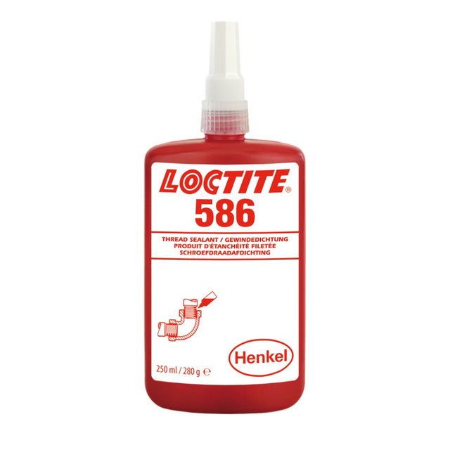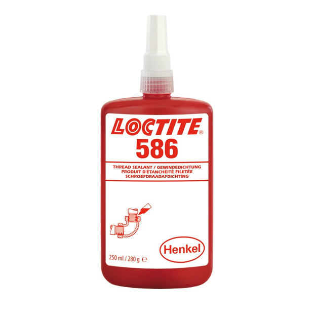 Die Loctite 586 Gewindedichtung ist ein flüssiges Dichtmittel, das sich beispielsweise für Messing und andere Metalle eignet. Es wird nicht für Kunststoffe und Ähnliches empfohlen. Es wird zur Abdichtung von Gewinden an Rohren und Formstücken verwendet, wo es in der Fuge zwischen zwei Metalloberflächen aushärtet und die Verbindung abdichtet. Loctite 586 wird hauptsächlich als Gewindedichtung gegen Wasser, aber auch gegen Öl und andere gängige organische Flüssigkeiten eingesetzt. Nach dem Aushärten dichtet es die Verbindung ab und schützt sie vor Leckagen oder Lockerung, was häufig durch Stöße und Vibrationen verursacht wird – dagegen ist Loctite 586 hochbeständig. Das flüssige Dichtmittel Loctite 586 kann bis zu einer Temperatur von 150 °C verwendet werden, darüber hinaus hält es der Temperatur nicht stand und es kommt zu irreversiblen Schäden.