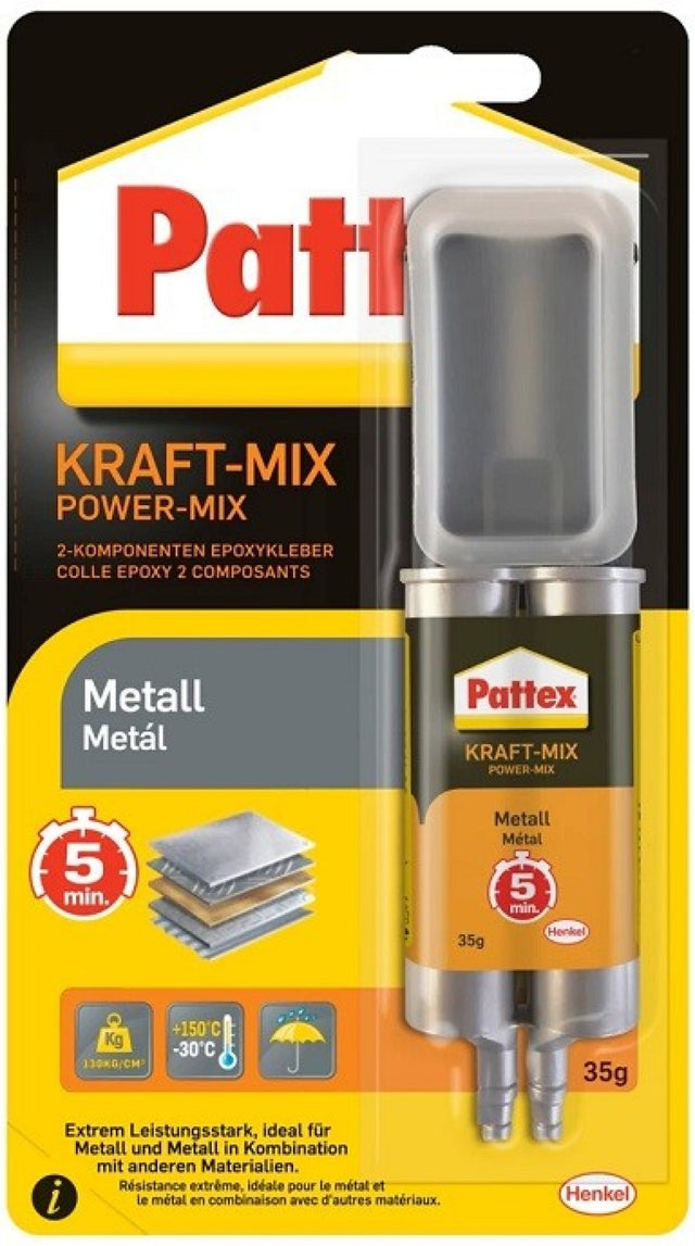 PATTEX Flüssiges Metall ist ein zweikomponentiger Epoxidkleber in Metallfarbe, der sowohl für den Innen- als auch für den Außenbereich geeignet ist. Es ist zum Kleben von Metallen, Stahl, Aluminium und vielen weiteren Materialien bestimmt, außer PE, PP und PTFE.