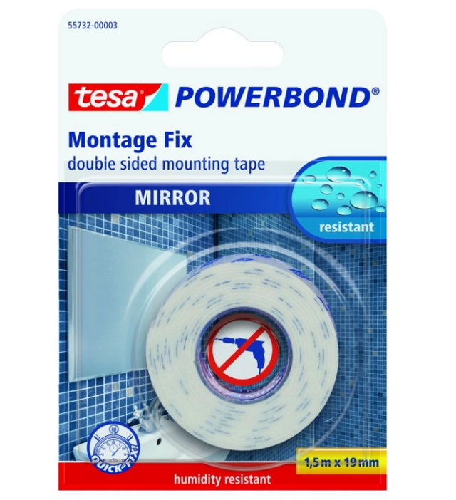 Das Tesa Powerbond MIRROR Spiegelklebeband bietet eine schnelle und einfache Möglichkeit, Spiegel und andere flache Gegenstände in Feuchträumen dauerhaft aufzuhängen.
